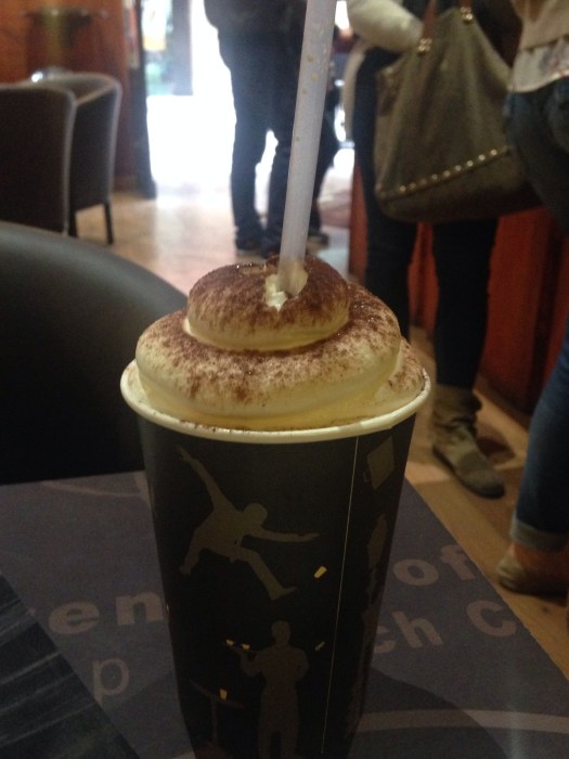 Words cannot describe the sensation of drinking a French cappuccino! When one drinks through a straw, one’s mind expects cold, but this is hot coffee -that is freshly whipped cream on top!!! My mind and taste buds are very confused. It was strangely very yummy though