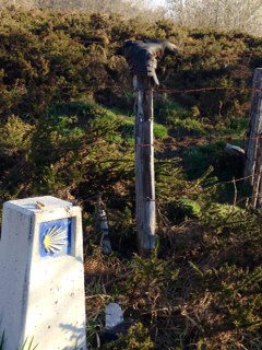 They say you are what you eat-I don’t remember eating a frigging legend! Today I walked nearly 18 kms through rain, hail, SNOW and fog so thick there was only 10 meters visibility!!! At times it was really scary as the path is so close to the edges. I thought someone was joking when he warned me to be careful not to fall over the edge along the ridge. Probably not normally a problem but the fog was so thick it was difficult to see the path. The snow was hard going and quite deep in places and I actually thought I was getting frostbite on my fingers from the icy wind. To conquer the mountains are a feat, but the conditions today were quite challenging. I was really glad to be walking with someone else because it gave us extra courage. So chuffed that the worst two days are over, but it was strangely exhilarating. Having been told many stories of the hungry birds and pilgrims, I saw some really huge vultures (the size of a small pterodactyl) circling above, so I was a little worried about slipping and injuring myself! Strangely enough, I absolutely loved today -everything about it. It was so exciting. (Sorry about the random flower picture -nothing to do with the mountain but I can’t get rid of it! The walk down was difficult because of the snow, the mud and the rocks, and it was very steep, but I MADE IT, walked through lots of birch forests but they were a bit spooky as they are still barren from the winter. Spring was more evident on the descent and leaves and little wild flowers were appearing. Now at Roncesvalles, in the Albergue. Went to the pilgrim mass and had a blessing, the trotted over to the restaurant for the pilgrim meal (pasta in tomato sauce with chorizo, trout chips and salad, and rice pudding with free red wine-really nice by the way) food and lodging $10!Bron – you HAVE to do this! You would absolutely love it! Although you might like to do it a bit later than April.