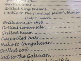 I ordered the attacked mushrooms to see what they were. Assuming they translated that as “assaulted” instead of salted!! And can anyone please tell me what ‘cockle to the sailors blouse’ could be? I didn’t order the ‘perfect’ asparagus either. Chatted to and got caught up with a couple of Irish men – Connor the doctor and James the engineer. Gerard tried to keep up with them, even though I warned him it is impossible to keep up with the Irish. Needless to say, it is now 9.30am, he is still asleep and nursing a huge hangover. We didn’t get home till 1.30. I stayed sober (older and wiser)!