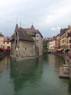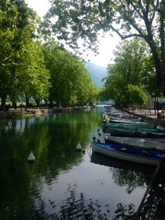 I spent the day wandering the city. It is actually quite huge, and it’s full of tourists. Most people seem to ride bikes, as the town itself is very flat. Huge mountains loom in the distance and I am very glad that I don’t have to climb them! Annecy is called the Venice of France because of its canals and arched bridges. Restaurants line the canals and there are beautiful hanging baskets all along the edge.