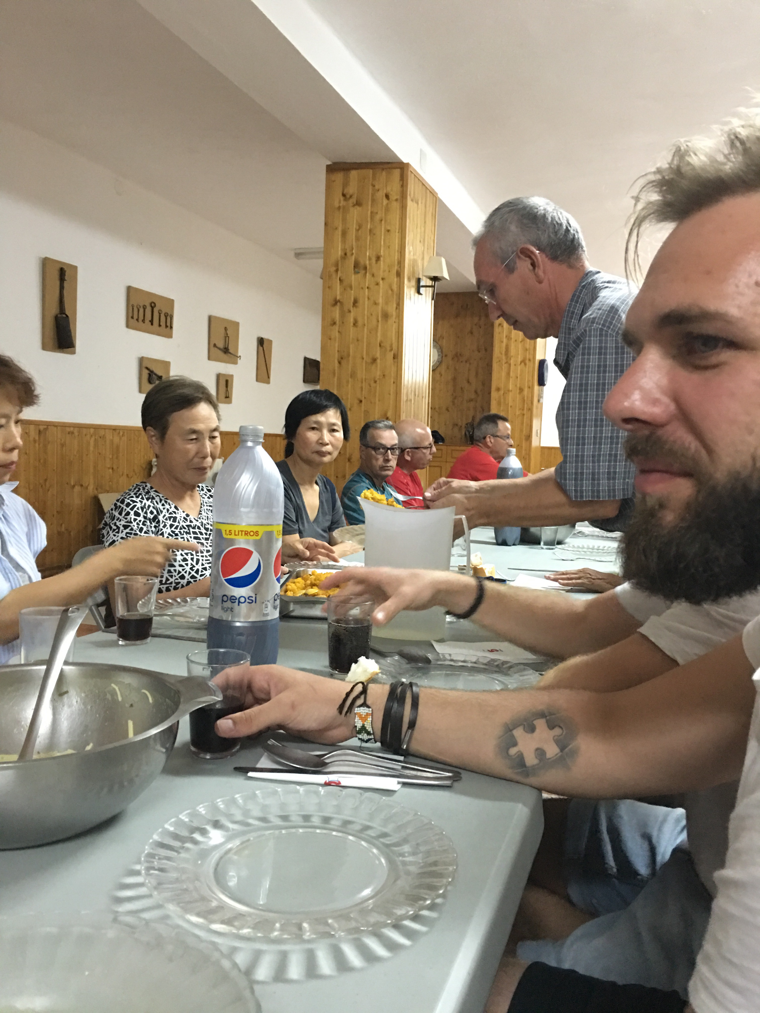 We had noodle soup, seafood paella, garlic chicken and potatoes, pork, bread,Pepsi and water, and banana for dessert. I sat next to two Italians (Antonio and Fabio) -such classic names- and enjoyed the conversation. Antonio is studying wine, so he has been sampling the local wines along the way. He knew about Australian wine and hopes to go to the Mornington Peninsula some time!