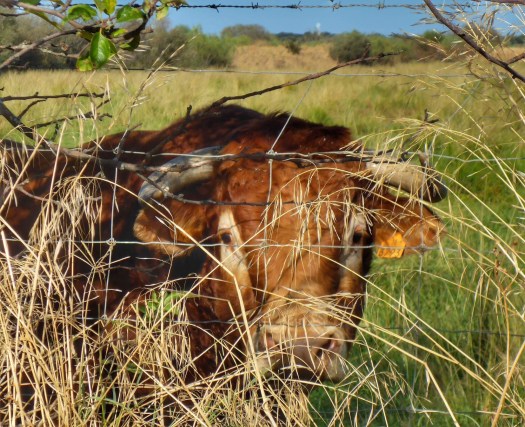 All was well with the world until we reached the paddock full of bulls. I discovered that Colleen has a phobia about cows. She copes with looking at them in the distance but this was different. A large black bull with very pointy horns locked eyes with her and she froze. I grew up on a farm and I was quite happy to walk over and shoo him away but fear had gripped poor Colleen and she was fully engaged in a massive panic attack. She wouldn’t let me leave her behind the tree and she was retching, sweating, shaking and almost crying with fear, clinging onto my backpack. It was awful! I tried to get her to quietly walk past the bull but it was impossible so we retreated to the shade and waited until he moved to the other side of the path. She rolled her red t shirt up to her underarms fearing the bull would charge at her and I led the way slowly past, advising her to look at her feet and not the bull, and soon the crisis was over. We reached the gate and she was absolutely white and so embarrassed at her irrational but very real fear.