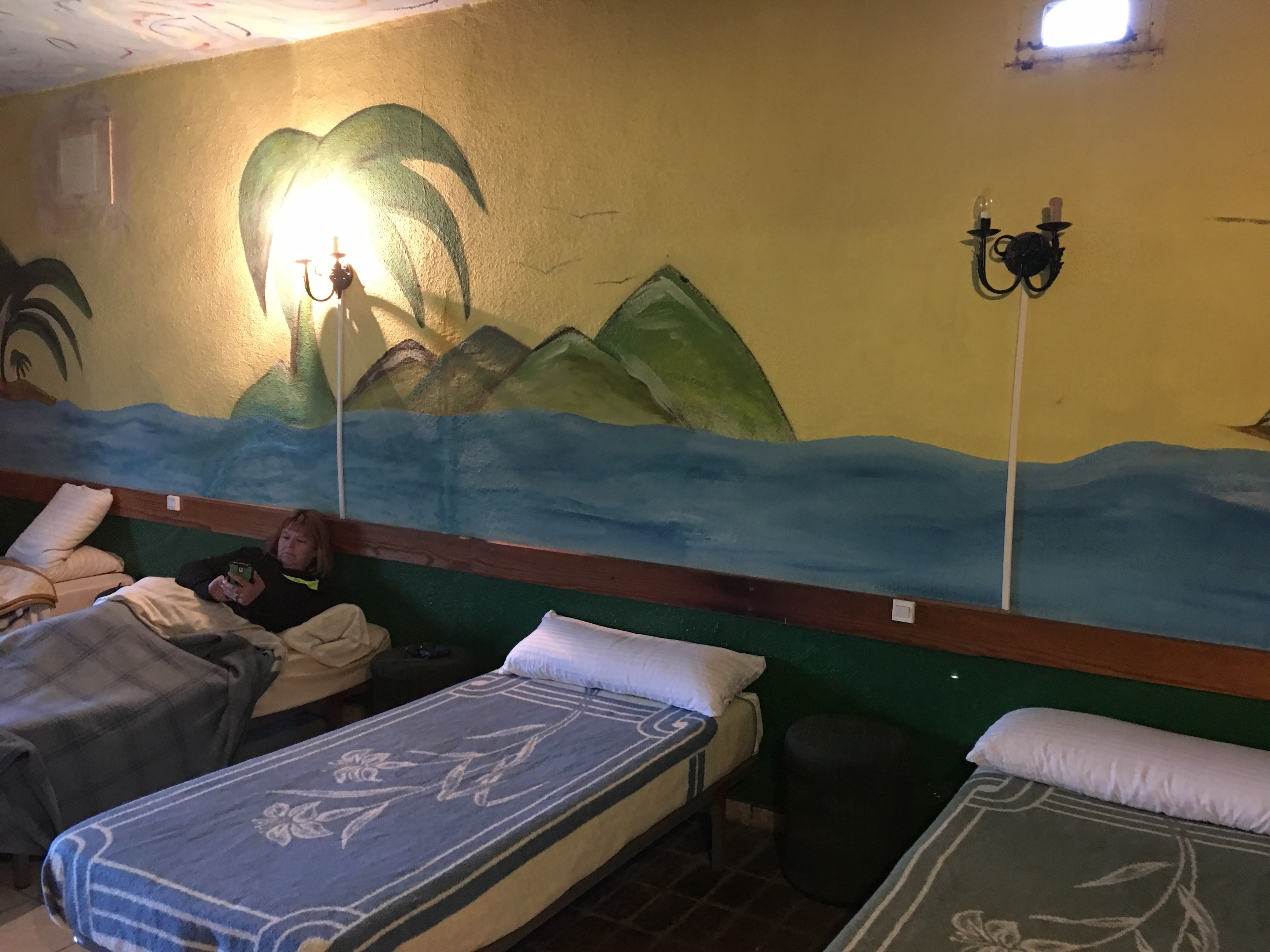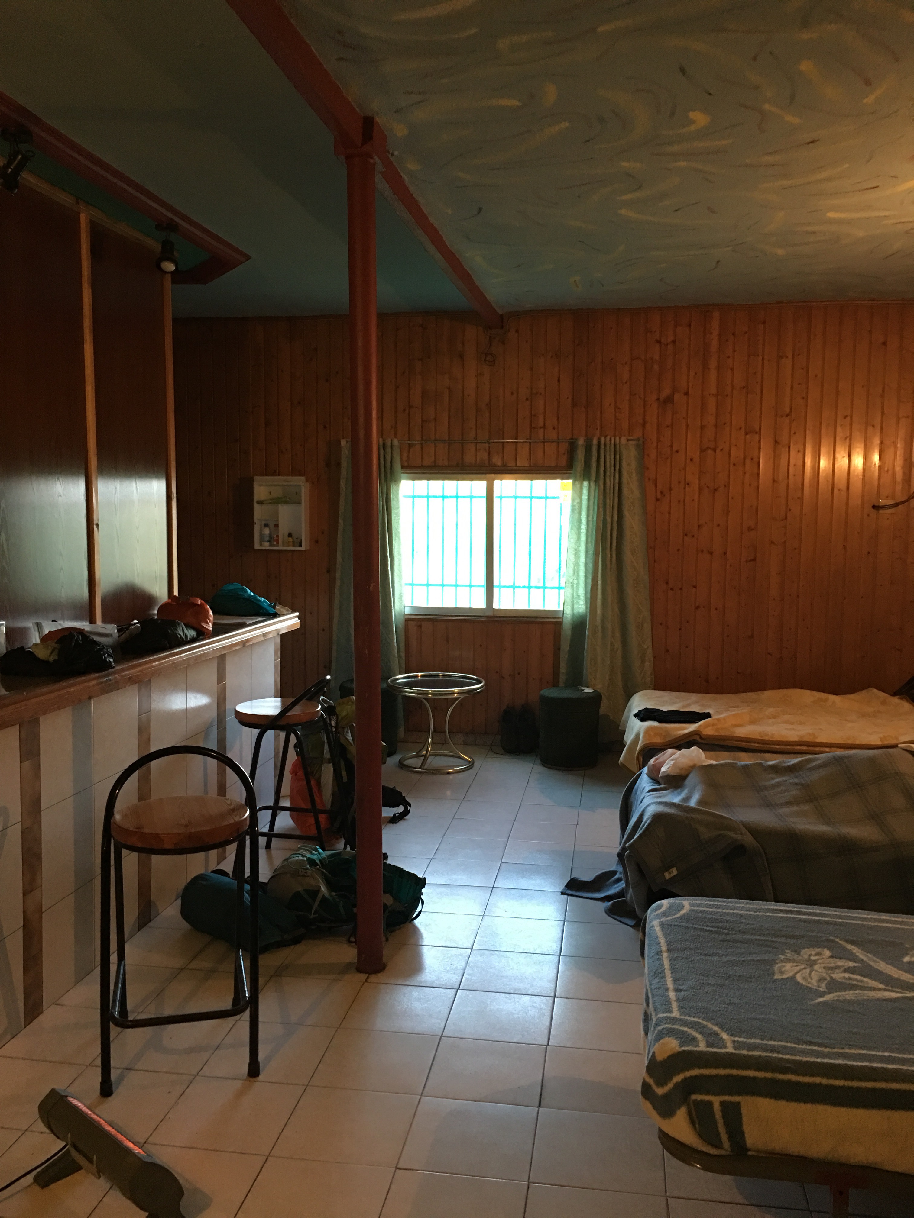 We went into the bar to see if they had accommodation and were shown into the bowels of the place to a large dormitory. The walls were painted with a tropical theme in an attempt to make it appealing, but it was an old disco room with a bar, no heating and a very average bathroom which we shared with the men drinking upstairs in the bar. (Who also played guitar and partied till 2am)
