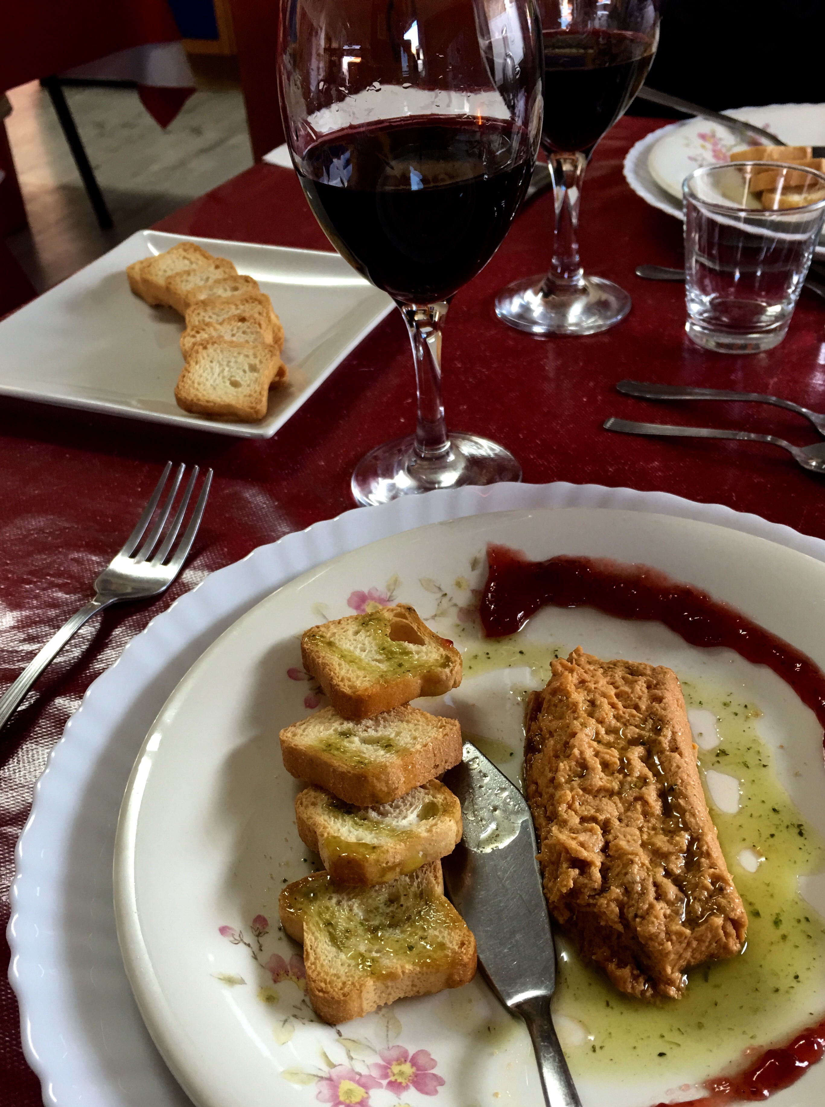 We chatted over coffee and then took off towards the next town, Rionegro del Puente, where we are now nestled in at a beautiful albergue. It is a renovated medieval building and very comfy. Across the road is the famous Me Gusta Comer, a gastronomic delight! In the middle of nowhere, this restaurant is the equivalent of a 4 or 5 stars. We wandered in, sat down and a magnificent lunch just appeared in front of us. Everything is home made, fresh produce and absolutely delicious. There was no choice. It was just given to us. Tuna mousse served with jam and olive oil, followed by mushroom risotto and flan. Unlimited red wine, coffee and 3 jugs of different liqueurs.