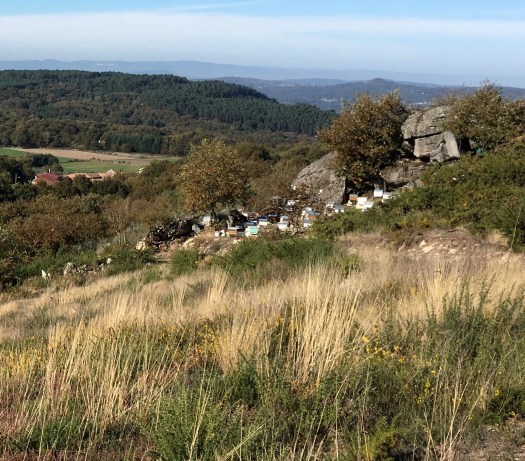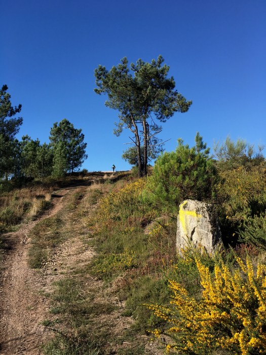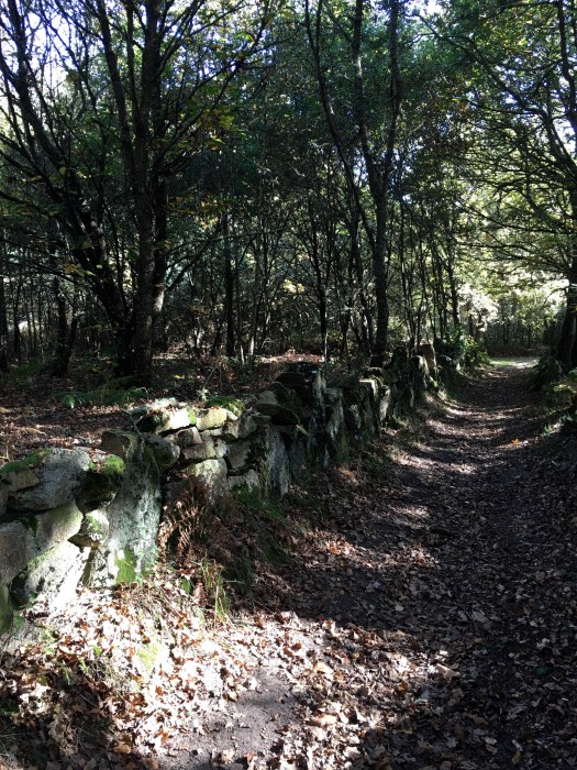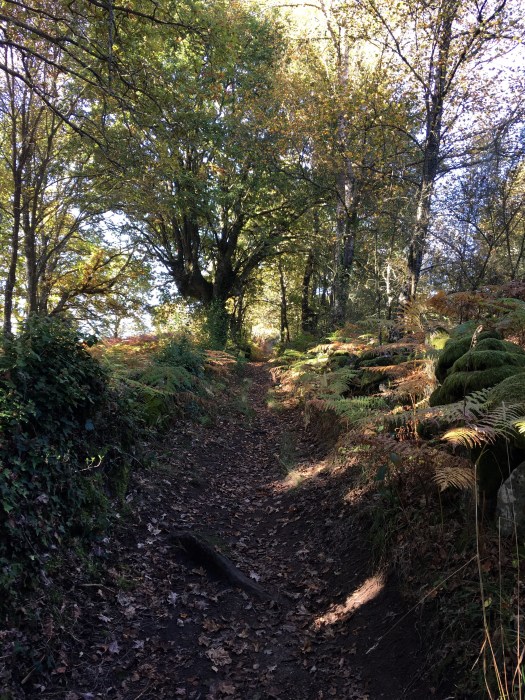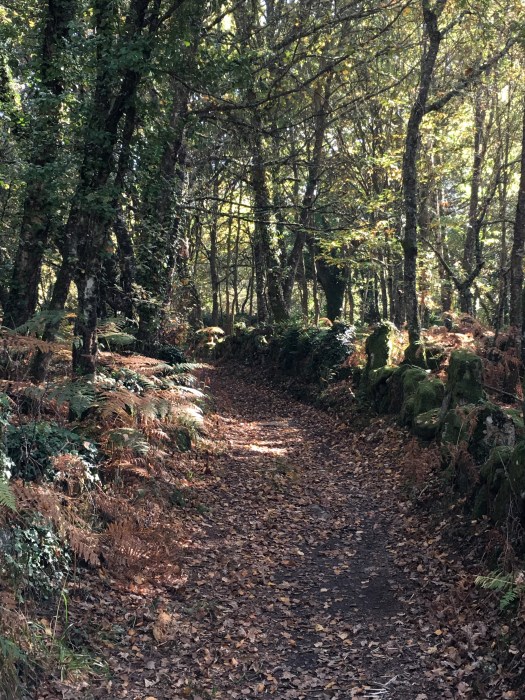 It was a gentle walk today, mostly on flat land but we felt a little nervous as we could hear shotgun blasts in the forest we were walking through. We came across many hunters and their dogs along the path, and we knocked off the first 8 kms very quickly as we walked quite quickly to get through the forest. Again, we walked through some beautiful little villages, past heaps of veggie patches, lots of dogs and cats and just meandered along enjoying the scenerythe farmers are tilling their land ready for the next crops. We walked past a huge pile of steaming pooAnd then we walked into another forest. This is real Galicia now with its damp air, moss covered rocks and stone fences, oak and chestnut trees which are dropping their leaves and fruit onto the rocky paths. The smell is amazing, the colours so vibrant as Autumn turns to winter. It has a ‘feel’ about it and you imagine goblins and fairies hiding. Butterflies and moths flitter around you and you hear nothing but the birds. It really is magical.