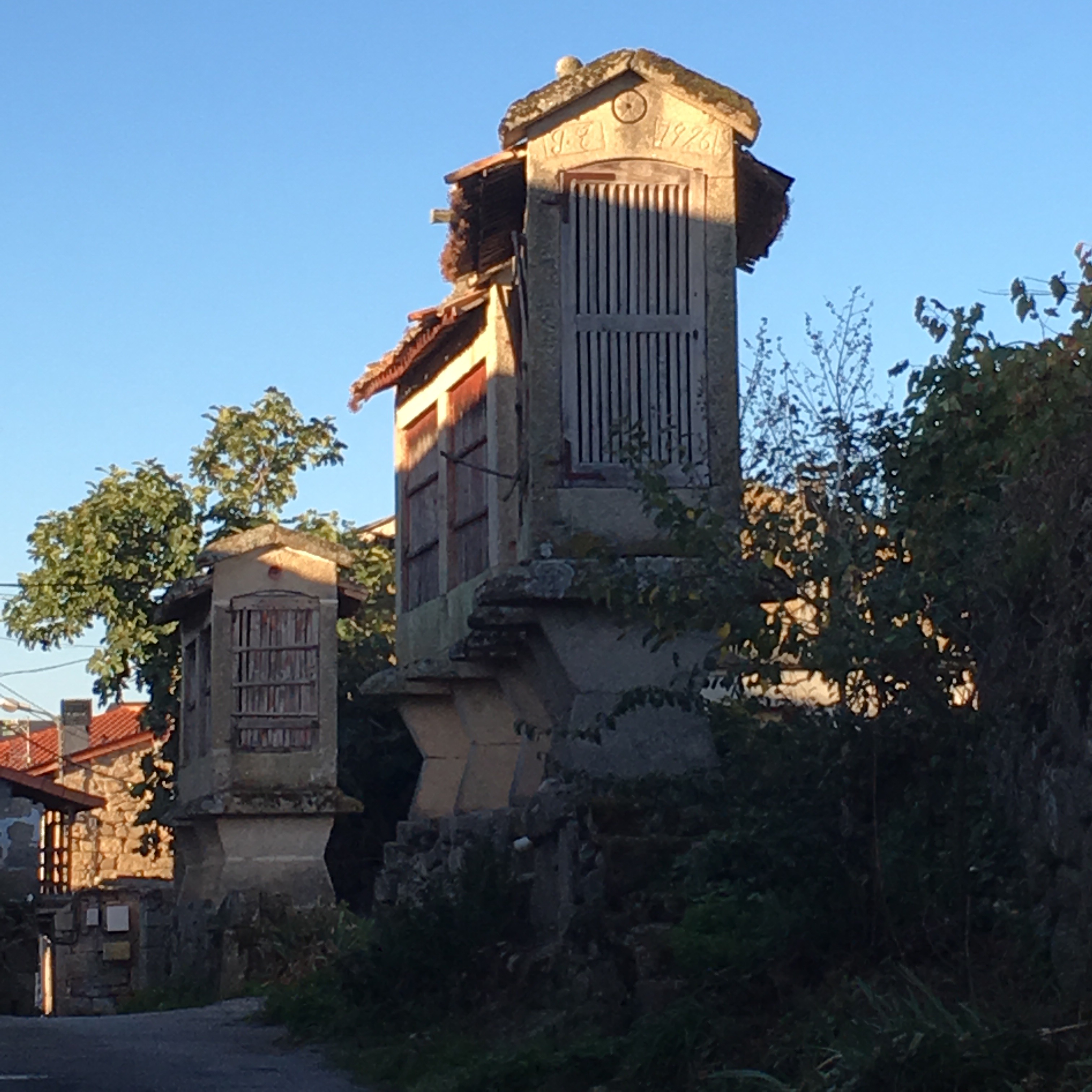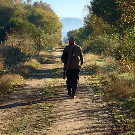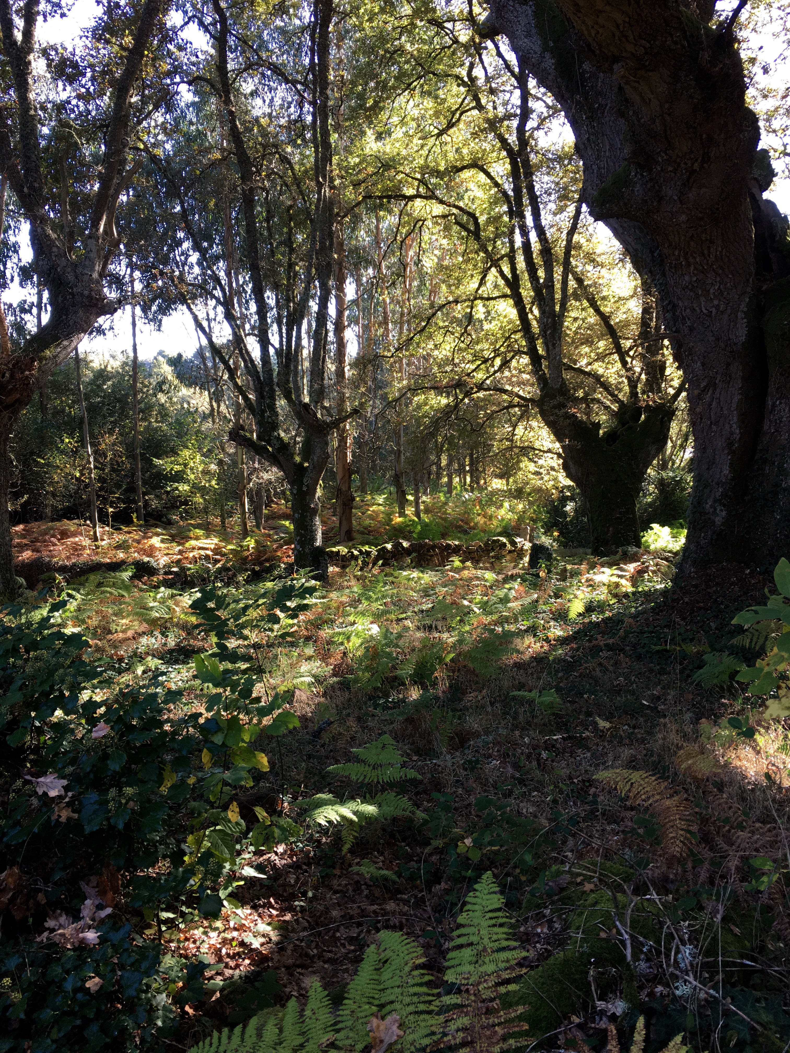 It was a gentle walk today, mostly on flat land but we felt a little nervous as we could hear shotgun blasts in the forest we were walking through. We came across many hunters and their dogs along the path, and we knocked off the first 8 kms very quickly as we walked quite quickly to get through the forest. Again, we walked through some beautiful little villages, past heaps of veggie patches, lots of dogs and cats and just meandered along enjoying the scenerythe farmers are tilling their land ready for the next crops. We walked past a huge pile of steaming pooAnd then we walked into another forest. This is real Galicia now with its damp air, moss covered rocks and stone fences, oak and chestnut trees which are dropping their leaves and fruit onto the rocky paths. The smell is amazing, the colours so vibrant as Autumn turns to winter. It has a ‘feel’ about it and you imagine goblins and fairies hiding. Butterflies and moths flitter around you and you hear nothing but the birds. It really is magical.