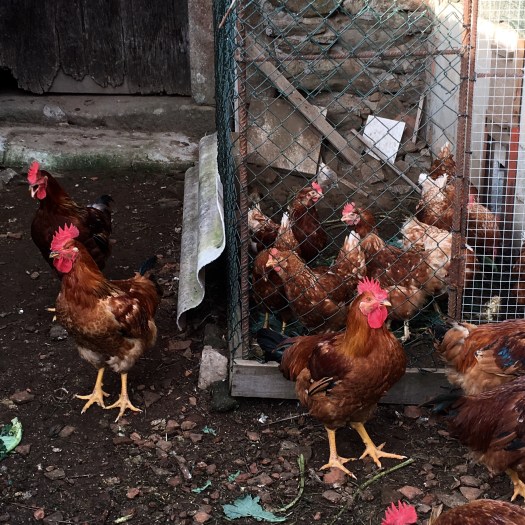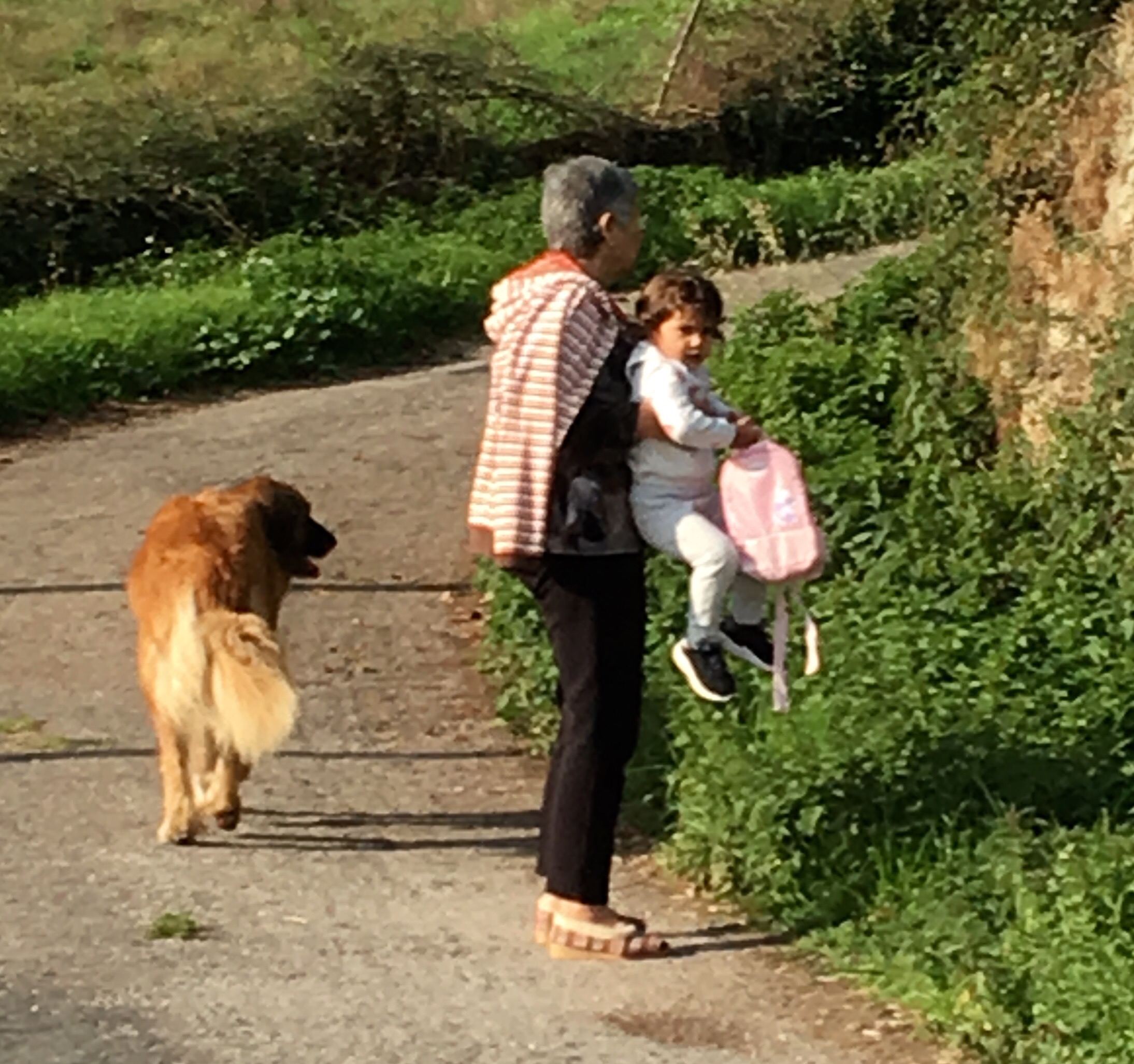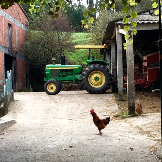 Anyway, we waited for them all to leave in the morning, and then we went back to our bar for breakfast. We had a late start because of this and even though we only walked 16 kms today, it took us ages, as we sauntered along more beautiful lanes lined with oak and chestnut trees, apple trees, blackberry bushes etc. we passed farms with loads of chooks, dogs, horses and even a few donkeys. And there were arrows on this overpass….why? Where else did they think I could go?which one is Colleen?