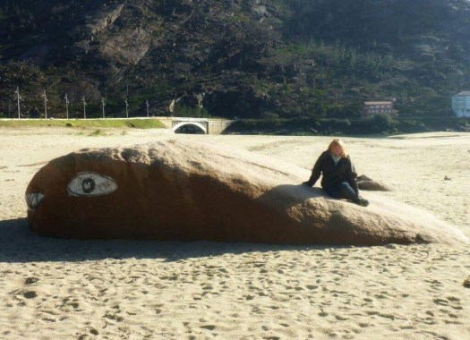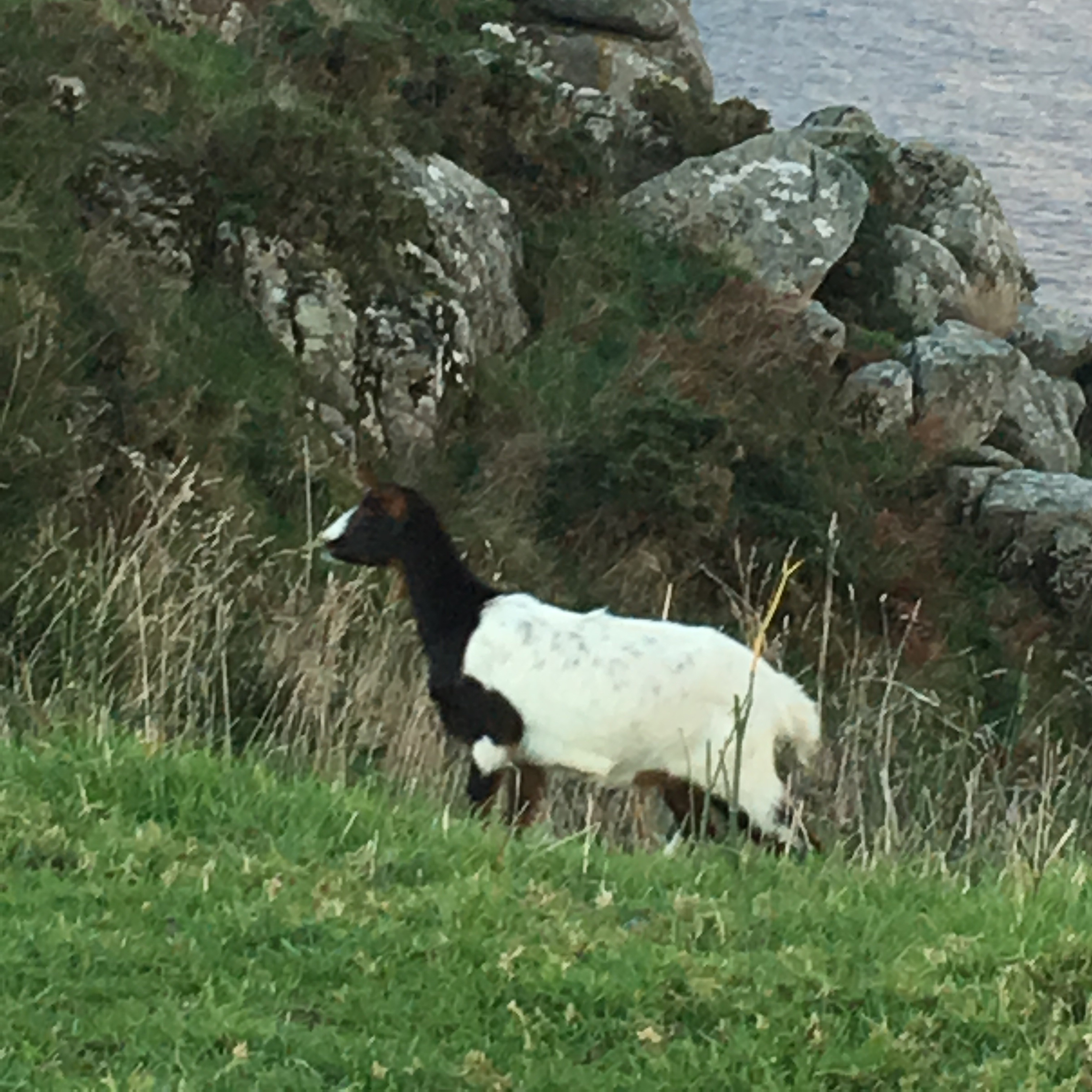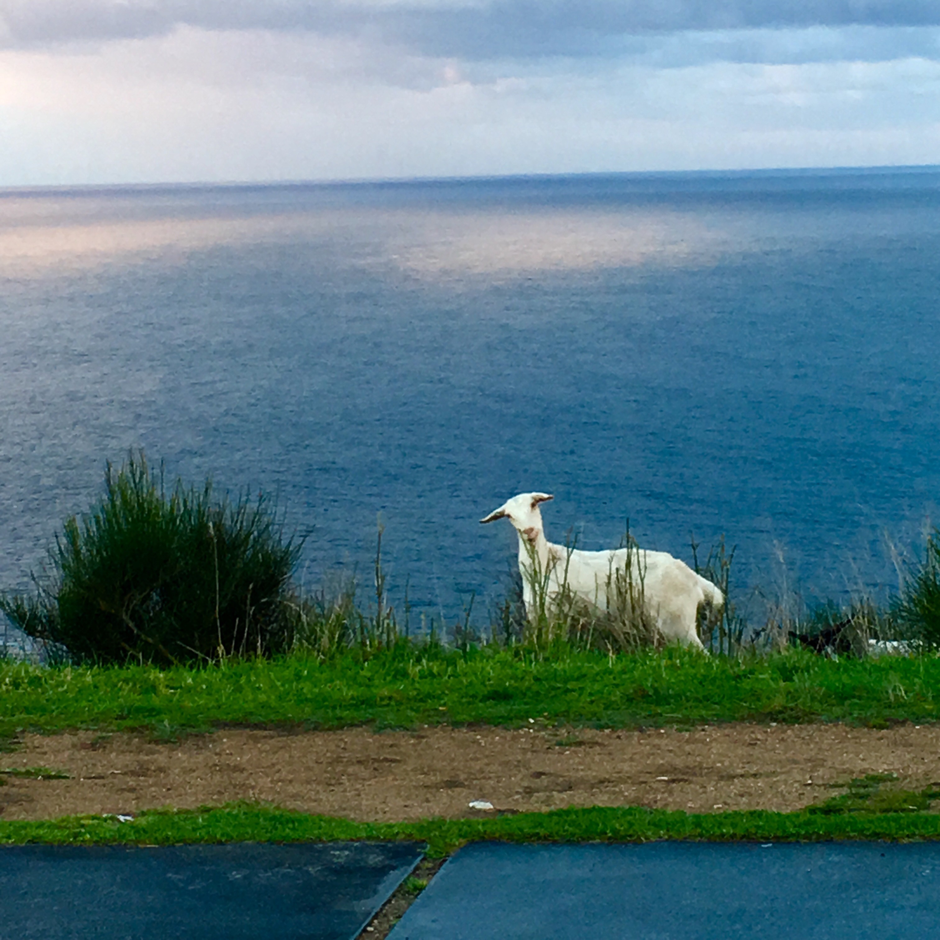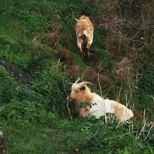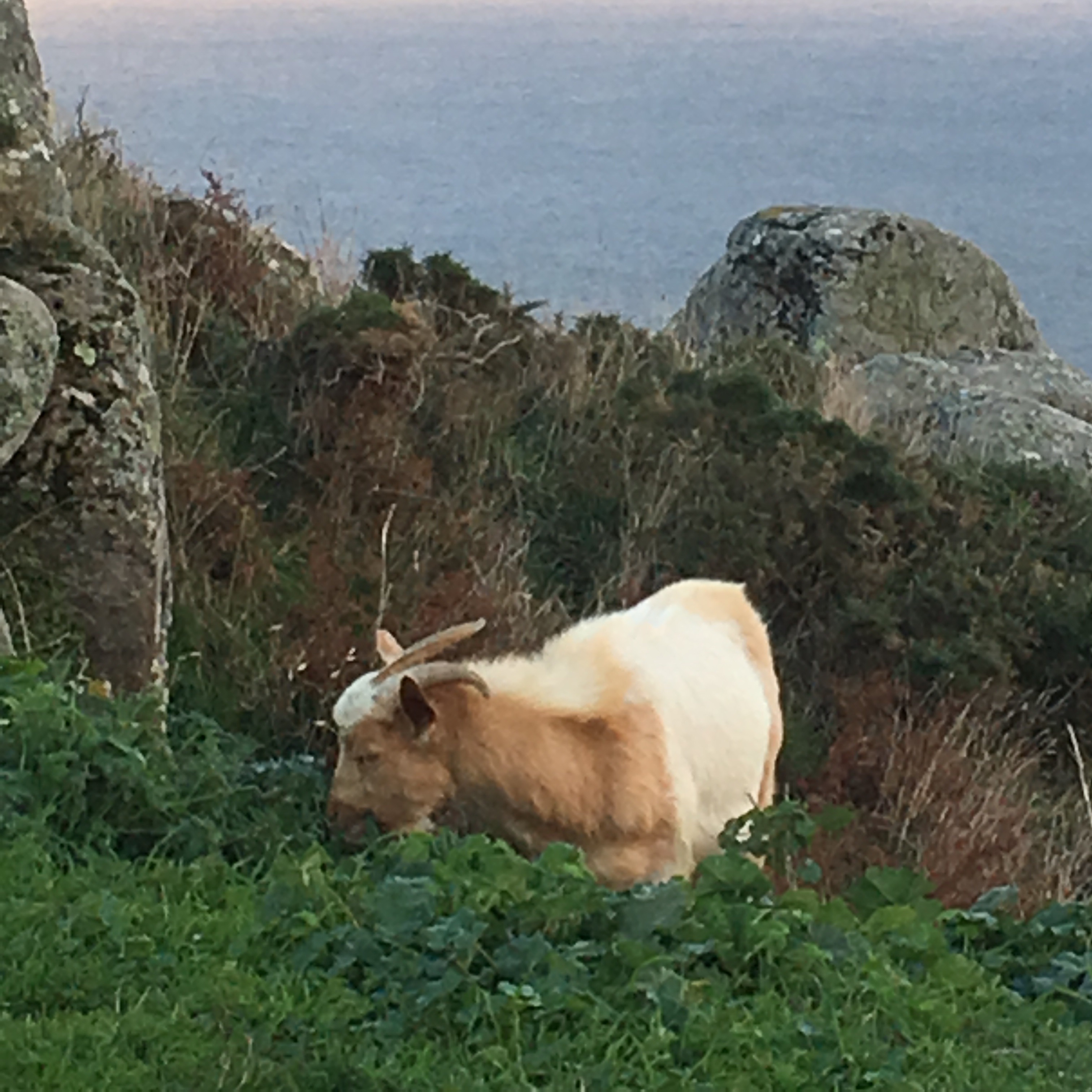 Although I reached Finisterre, my travels have not yet ended. We rented an apartment for two nights nearby in Corcubion, so we could drive the coast and have a look around. Got up early this morning and went to Finisterre again to watch one last sunrise, and the rain cleared especially for us. The crazy mass of people from yesterday had gone and it was so peaceful and meant so much more. Whilst waiting for the sun to peep from behind the clouds, we sat in the car to warm up a bit. Gerry nonchalantly commented that he could see a goat in the rear vision mirror, and I turned around to be greeted by this beautiful face! It’s like he was surprised to see us and was quizzically saying WTF?I wandered over to him and found a herd (about 6 or 8 of them ) climbing up the cliff to get some greenery for breakfast. Such a random and unexpected gift!