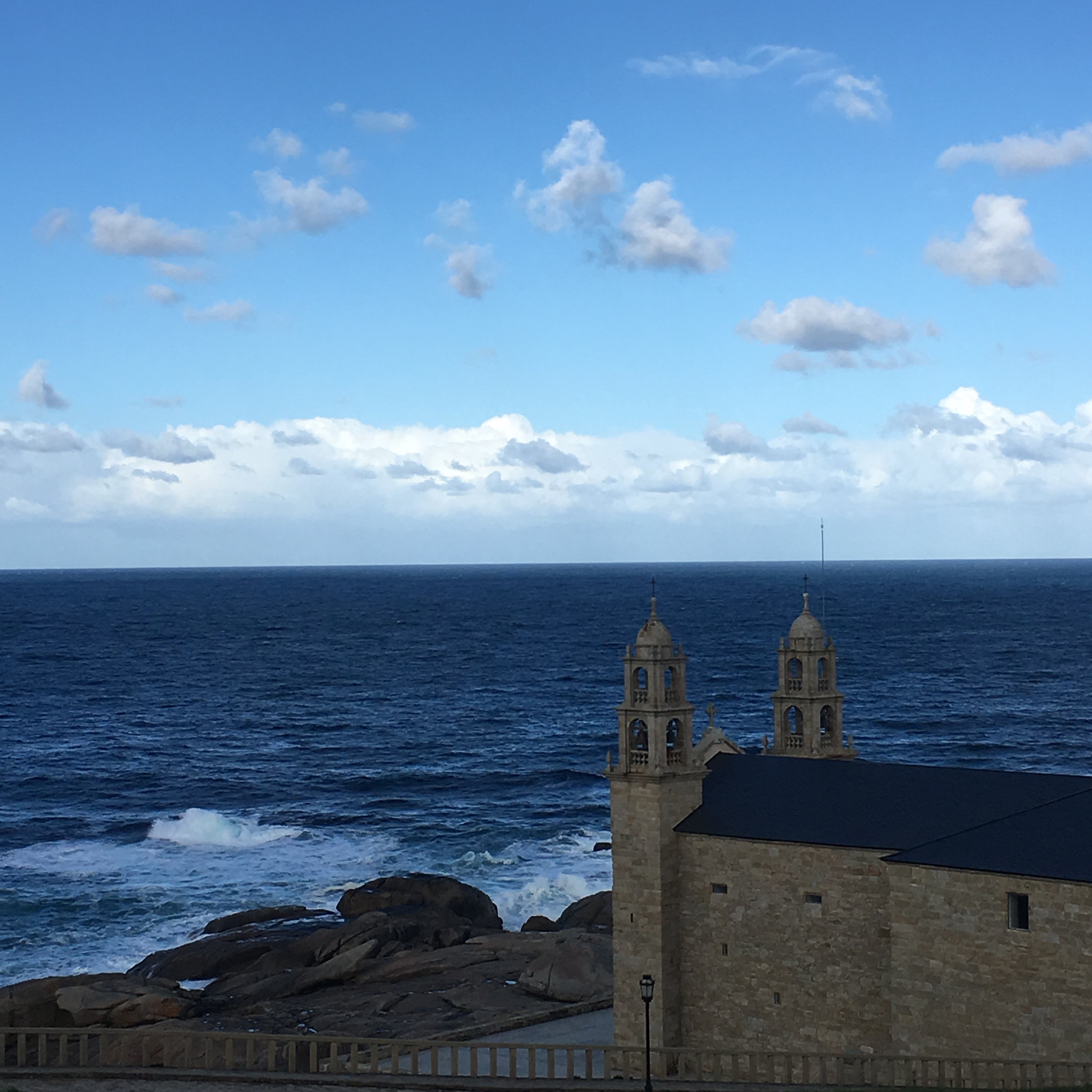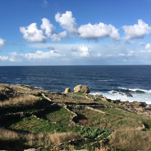 Satisfied that Finisterre was done and dusted, ticked off the list, we went in search of breakfast and drove to Muxia. What a beautiful place. I hadn’t been there before. We walked over the rocks towards the church and bumped into the Korean  girls once again. We hugged and said goodbye for probably the last time. Colleen wandered off to sit on a rock and do her ritual with the pebble she was carrying for a friend, and the notes she carried for others. I wandered off to climb to the top of the hill and take in the view. I sat amongst the ancient Celtic ruins and sent my thoughts and love with the wind. I prayed for those whose hopes and wishes I carried with me all the way from Australia. I cried again and felt the power of the ocean below, the gale force wind and the energy of the earth.