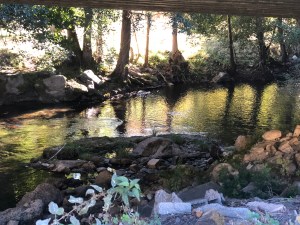 Heading back to Santiago, we decided to stop at Sarria for a coffee and watch the pilgrims in town. The sun thawed out our bones from the morning chill and it was lovely just sitting outside and relaxing. We got back in the car and headed towards Portomarin but stopped off on the way to visit another place that is usually flooded but as it hasn’t rained we could wander under the bridge and around the ruins of an old ?church and ?graveyard. We both had a creepy feeling and I was left wondering what had happened there in the past….a battle maybe? It looked like a movie set for Narnia or Lord of the Rings