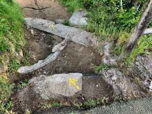 Yesterday was brutal – as no one had warned me of the hill on the first day, but mainly because The aforementioned JB had stated in his book that after the “hill”, there was a relatively flat path. That promise kept me going but in the end I was cursing like a sailor and I wanted to wring his neck. He lied! Perhaps it would be ok if we had started in Porto and had a few days walking already behind us but we felt we were climbing Mt Everest! Sometimes almost vertical, with constant rain and chilly wind, we plodded on. I discovered that peeing behind the bus stop with a poncho on is quite easy and it could even be done in the open – nobody can see anything (except if it is see-through, but mine is dark blue so I was ok)