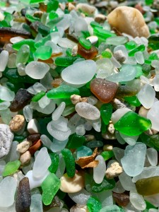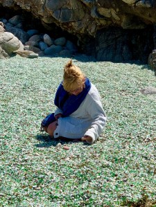 next thing I knew, we were hurtling along the highway heading for destinations unknown. Spanish music blaring in the car and glimpses of forests, farms and tiny towns added to the fun and we finally came to a stop at the ”glass beach’. We clambered down to the water’s edge and spent the next half an hour playing with the beautiful green glass pebbles made smooth and shiny by the ocean’s waves. Looked like pretty jewels beneath our feet. It really was so pretty!