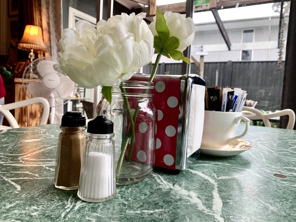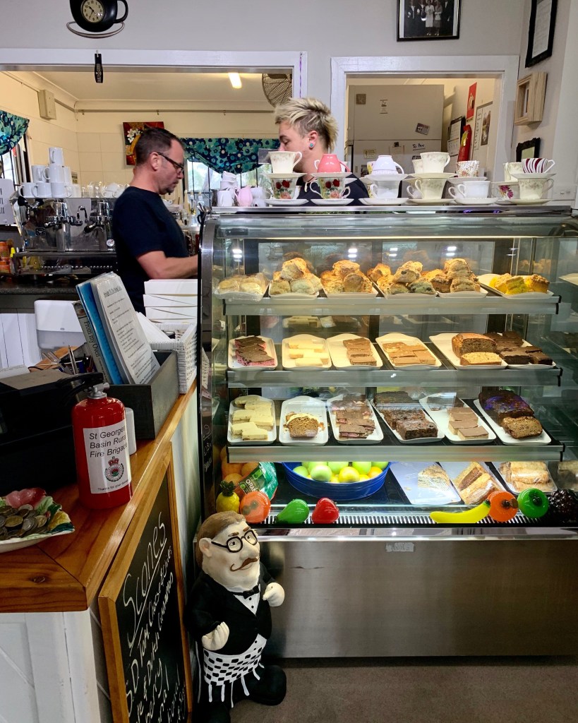I’m sitting in a memory! Perched on a vinyl chair at a table topped with green and white mottled laminex , I gaze upon the many photos from the area in the 1950’s. The scent of freshly baked scones, muffins and coffee fill my lungs. I’m almost floating back in time to memories of sitting at our green laminex table in the warm and cosy kitchen of my childhood, the scene of many a deep conversation and noisy dinners….the hub of the house. Back in the days where no one locked their doors, neighbours wandered in randomly and enjoyed a cuppa and a piece of cake, the kettle was always on the stove.