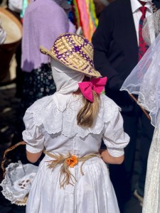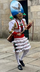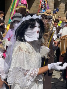 What a joy! It was right at midday when heaps of pilgrims were milling about in the main square , but after watching for 10 minutes,I wandered down to Pilgrim House to meet with Patti and sort out some travel arrangements. while we were sitting on the couch getting more and more confused, the parade came down our street so we dropped everything and went to watch. We got a much better view as they came down the street – so colourful and entertaining. I have no idea why this fiesta is happening as it contained all elements from the Carnival which is held at the end of winter in February- I read somewhere that they celebrate the same way for the end of summer, so here it is. Perhaps someone who knows more can elaborate on this (Johnniewalker?) and I can edit this post accordingly. Anyway, it was fun.